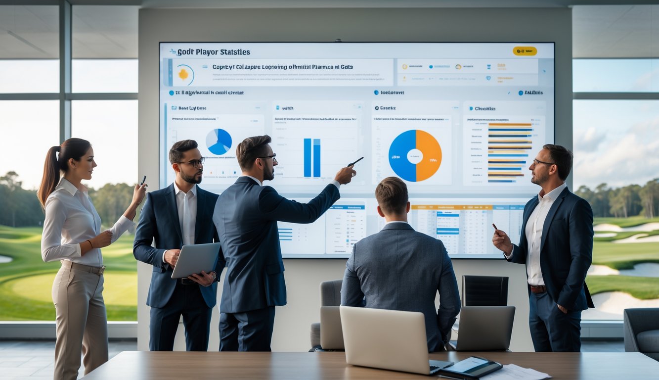 Sekelompok profesional sedang menganalisis data statistik pemain golf di sebuah kantor dengan layar digital besar dan pemandangan lapangan golf di luar jendela.