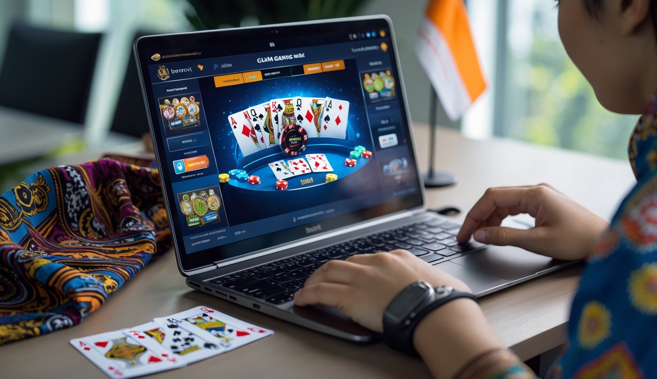 Seorang pemain menggunakan laptop untuk bermain poker online dengan latar belakang elemen budaya Indonesia.