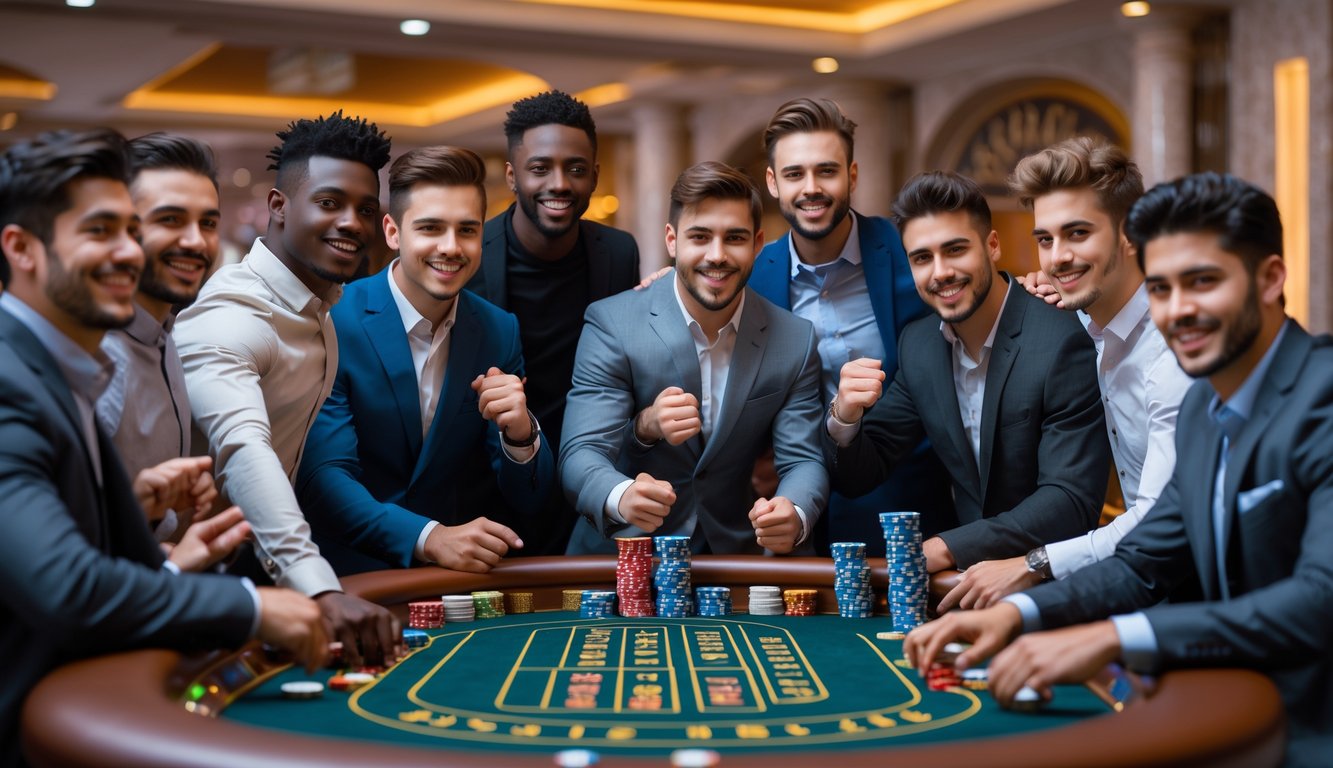 Sekelompok pria muda berkumpul di sekitar meja baccarat di kasino, tersenyum dan merayakan kemenangan.