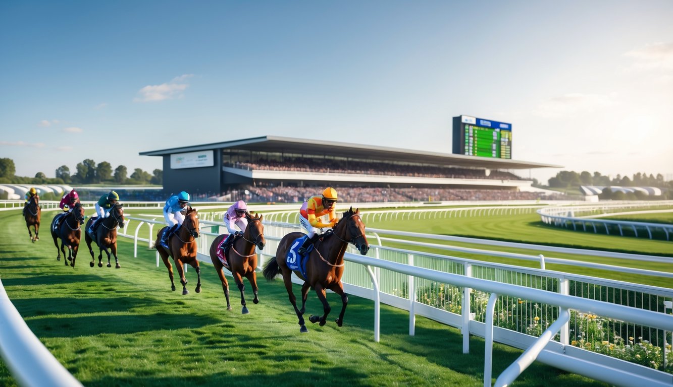 Lomba pacuan kuda dengan joki dan kuda berlari di lintasan, penonton di tribun, dan papan skor elektronik di latar belakang.