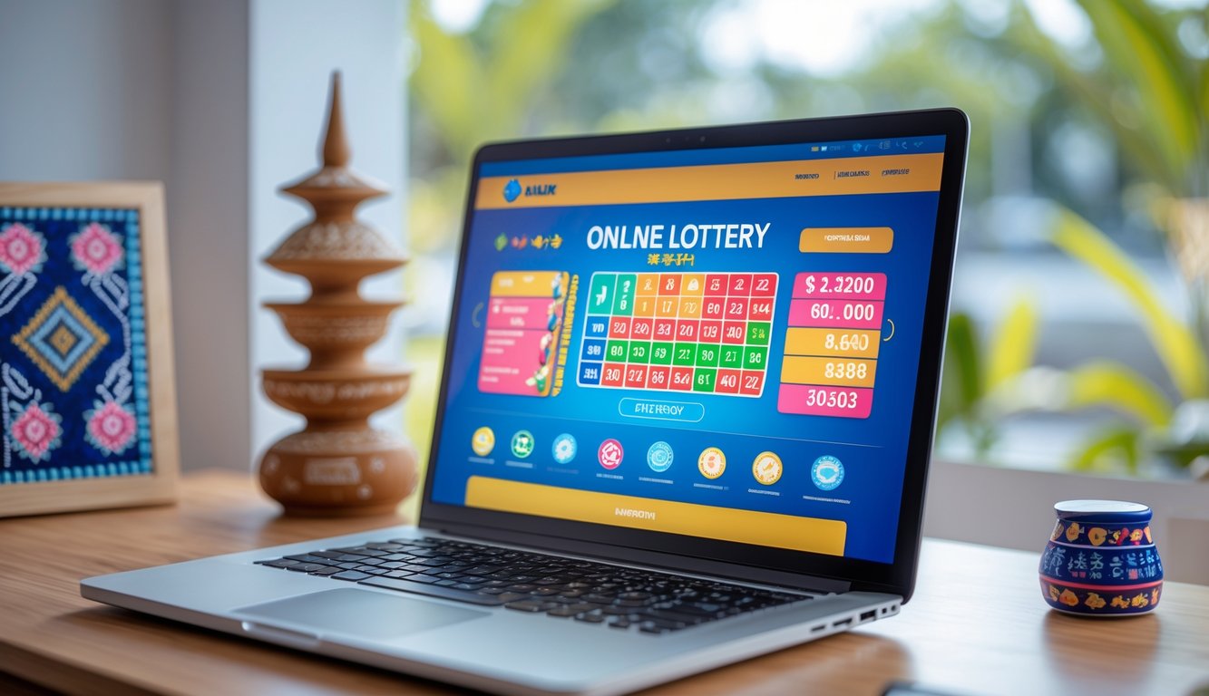 Seorang pengguna sedang melihat situs togel online di laptop di ruang kerja yang rapi dengan aksen budaya Indonesia.